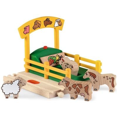Fun animal sounds on the wooden railway Put one of the farm animals in the yard Hear the animal sounds when a train drives past The horse neighs the pig grunts the cow moos and the sheep baas Birds sing if there are no animals in the yard Batteries included Fanimals in the yard Read More..